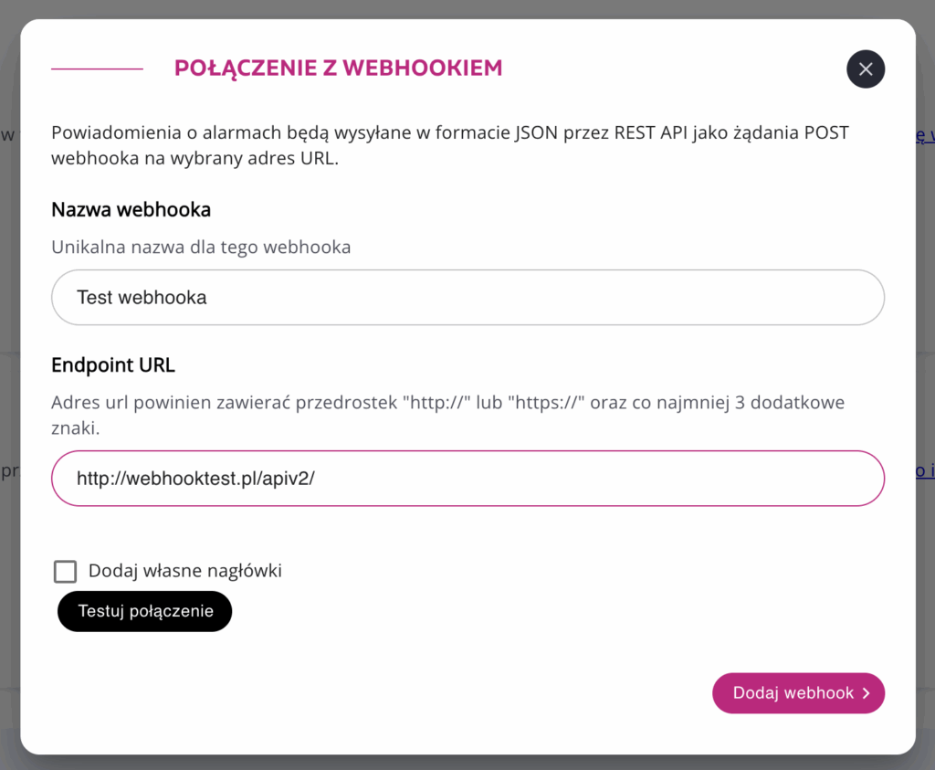 Po udanym teście kliknij Dodaj webhook, aby zapisać konfigurację.